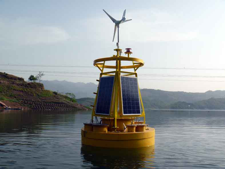 重慶長江水質(zhì)氣象監(jiān)測浮標(biāo)采用無人值守的智能控制系統(tǒng),完成對多個傳感器的控制以及數(shù)據(jù)的發(fā)送;太陽能電池板、風(fēng)力發(fā)電機和大容量蓄電池組成的風(fēng)光互補供電系統(tǒng),可保證系統(tǒng)在野外長期工作所需用電;浮標(biāo)標(biāo)體使用超高分子聚乙烯材料制作,具有較好的防腐能力、防止生物附著、不褪色、無毒性、抗碰撞能力強、抗雷電、無磁性等特點,適宜于三峽水庫復(fù)雜的水文水動力條件。