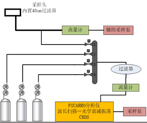 在輔助采樣泵的作用下,樣氣經過加熱型的氣體采樣總管,輸送至控制室,為了避免在長距離傳輸?shù)倪^程中目標氣體及水分子的滯留和損失,一般采用20L/min的輔助采樣泵進行采樣,分析儀通過自帶的采樣泵從輔助氣路采集10L/min的氣體進入分析儀進行分析,分析儀與支管接頭間安裝2um過濾器。分析儀采用10Hz的頻率測定CO2、CH4和H2O的濃度,分析儀可在單CO2和H2O測量模式、單CH4和H2O測量模式和同時測量模式運行。