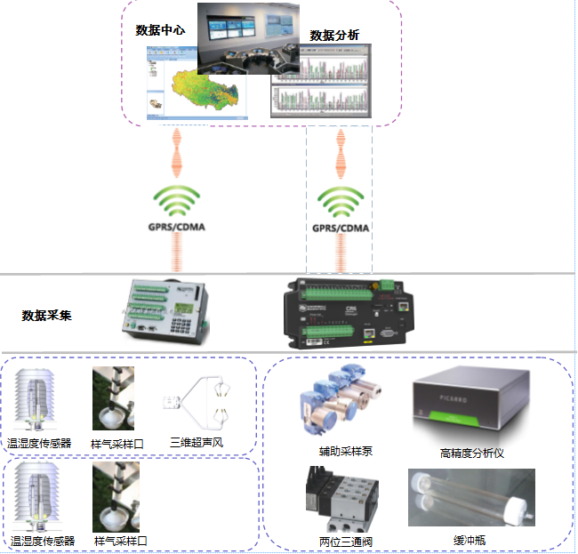Picarro 梯度通量觀測(cè)系統(tǒng)包括樣氣采集及處理單元、溫室氣體分析單元、供電單元、控制單元、校準(zhǔn)單元、數(shù)據(jù)采集、存儲(chǔ)及傳輸單元以及系統(tǒng)安裝附件。