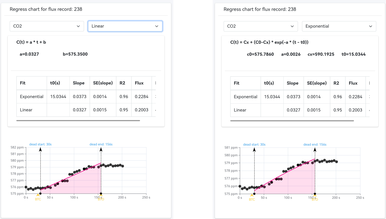 通過PFC內部微服務(Smart Chamber Software) ,可實現氣體的排放量的在線計算,支持線性和指數擬合兩套算法。對于生成的每條通量數據,都可以實現其對應的原始數據及擬合曲線的回放及調參后的重新計算。