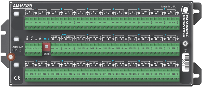 AM16/32B擴展板增加了數(shù)據(jù)采集器可以測量的傳感器的數(shù)量。AM16/32B可以通過4個復用端口(COM)順序地切換測量16組4線制的傳感器(共64線)。另外,用手動轉(zhuǎn)換開關(guān)可以把AM16/32B切換到2線模式,來順序測量32組2線制傳感器(總數(shù)同樣為64線)。